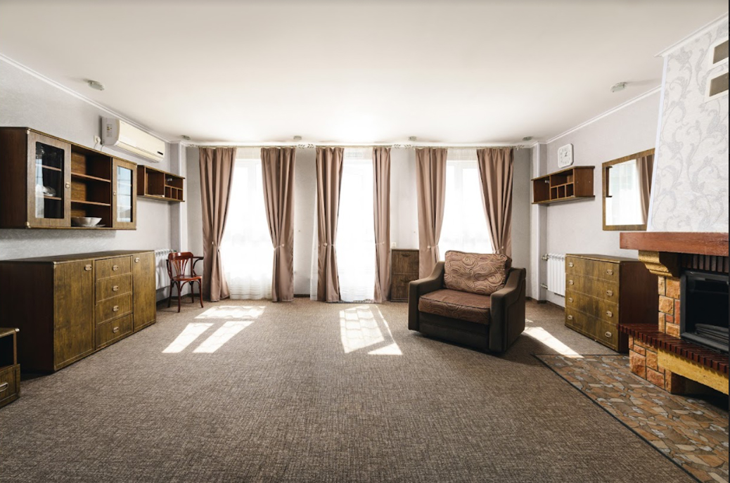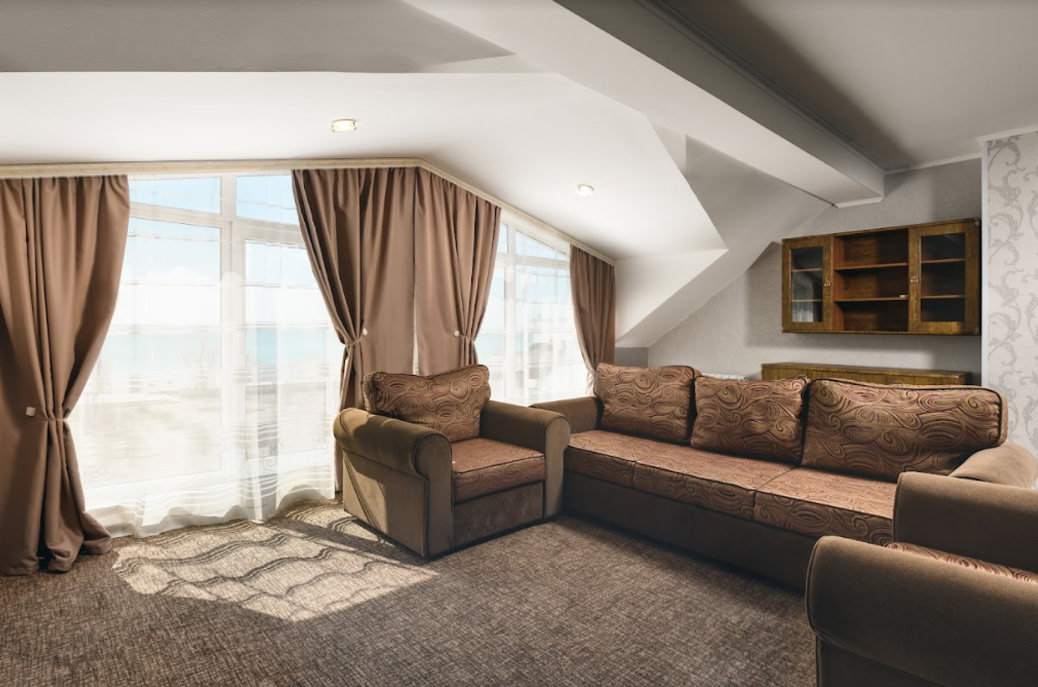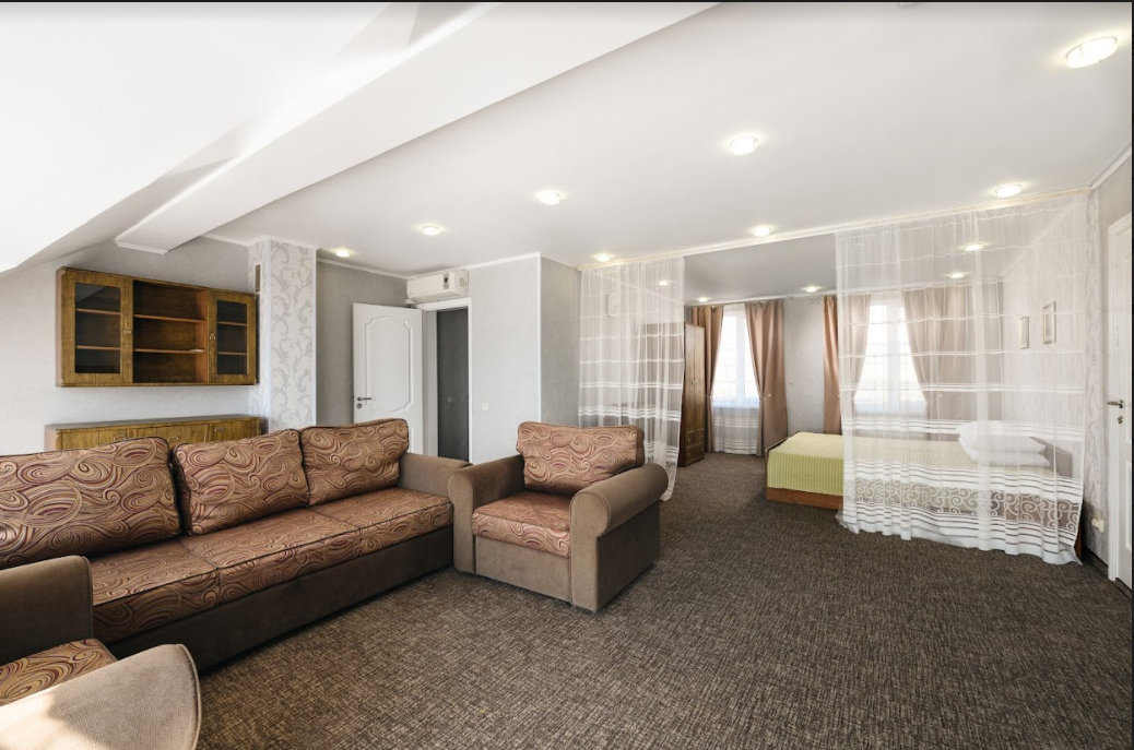 Площадь номера - 100 кв.м. 2 осн. места. 2 доп. места. Мебель: вешалка, диван, зеркало, комод, кресла, кровати односпальные, прикроватные тумбочки, стол, столик журнальный, стулья, тумба, шкаф. Оборудование: гладильная доска, кондиционер, сейф, стиральная машина, телевизор, утюг, холодильник, чайный набор посуды, электрочайник. Санузел: с душем, тапочки, туалетные принадлежности, фен, халат. Сервис: смена полотенец, смена постельного белья, уборка номера.