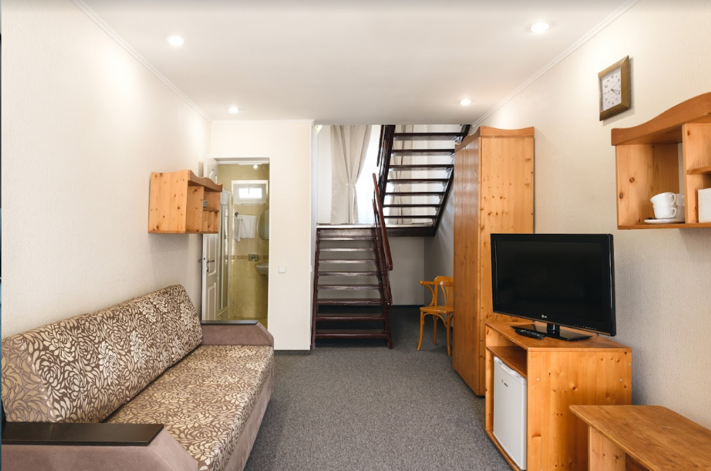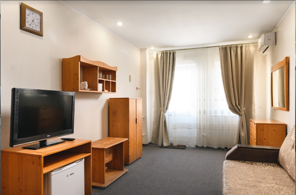 Площадь номера - 39 кв.м. 2 осн. места. 2 доп. места. Мебель: вешалка, диван, зеркало, комод, кровати односпальные, прикроватные тумбочки, столик журнальный, стулья, тумба, шкаф. Оборудование: гладильная доска, кондиционер, сейф, телевизор, утюг, холодильник, чайный набор посуды, электрочайник. Санузел: с душем, тапочки, туалетные принадлежности, фен, халат. Сервис: смена полотенец, смена постельного белья, уборка номера, услуги телефонной связи по территории отеля.