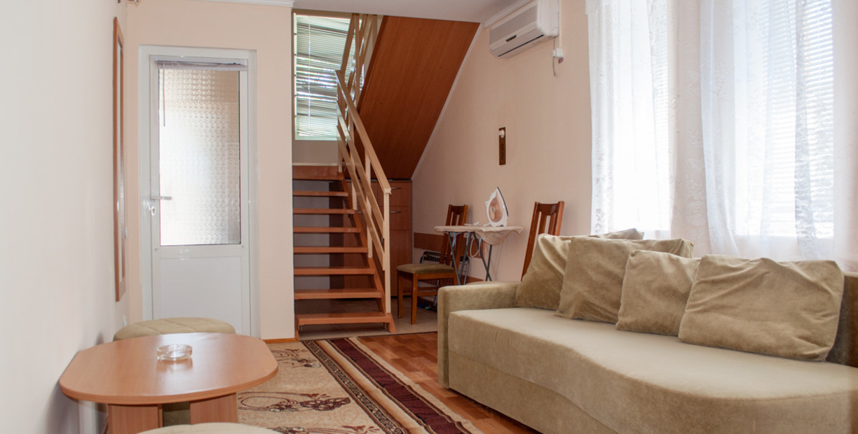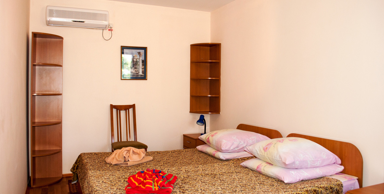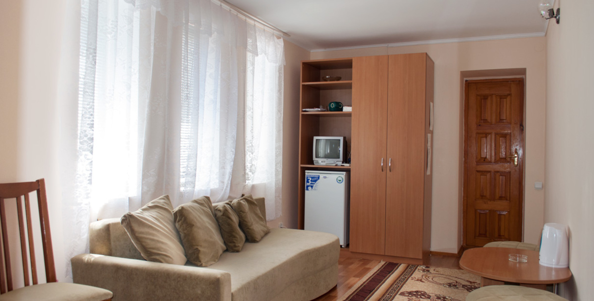 Площадь номера - 33 кв.м. 2 осн. места. 2 доп. места. Мебель: вешалка, диван, зеркало, комод, кровати односпальные, прикроватные тумбочки, стол, столик журнальный, стулья, шкаф. Оборудование: гладильная доска, кондиционер, сейф, телевизор, утюг, холодильник, чайный набор посуды, электрочайник. Санузел: с душем, туалетные принадлежности, фен. Сервис: смена полотенец, смена постельного белья, уборка номера.