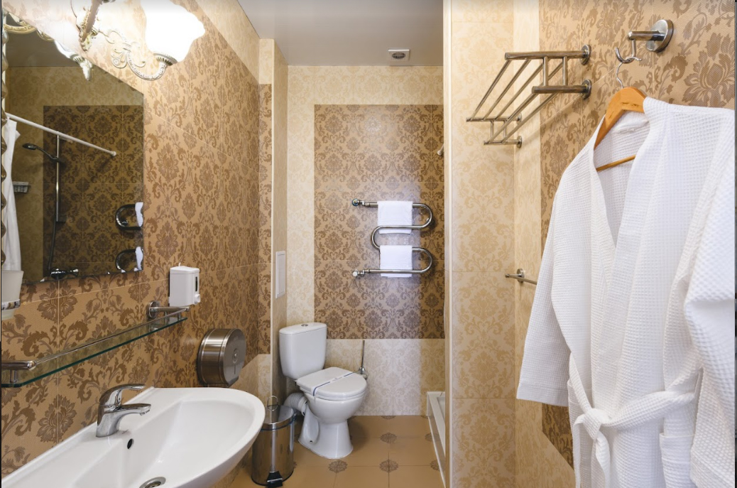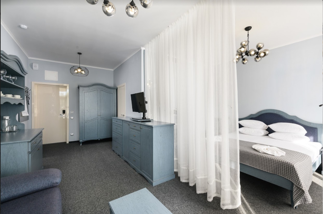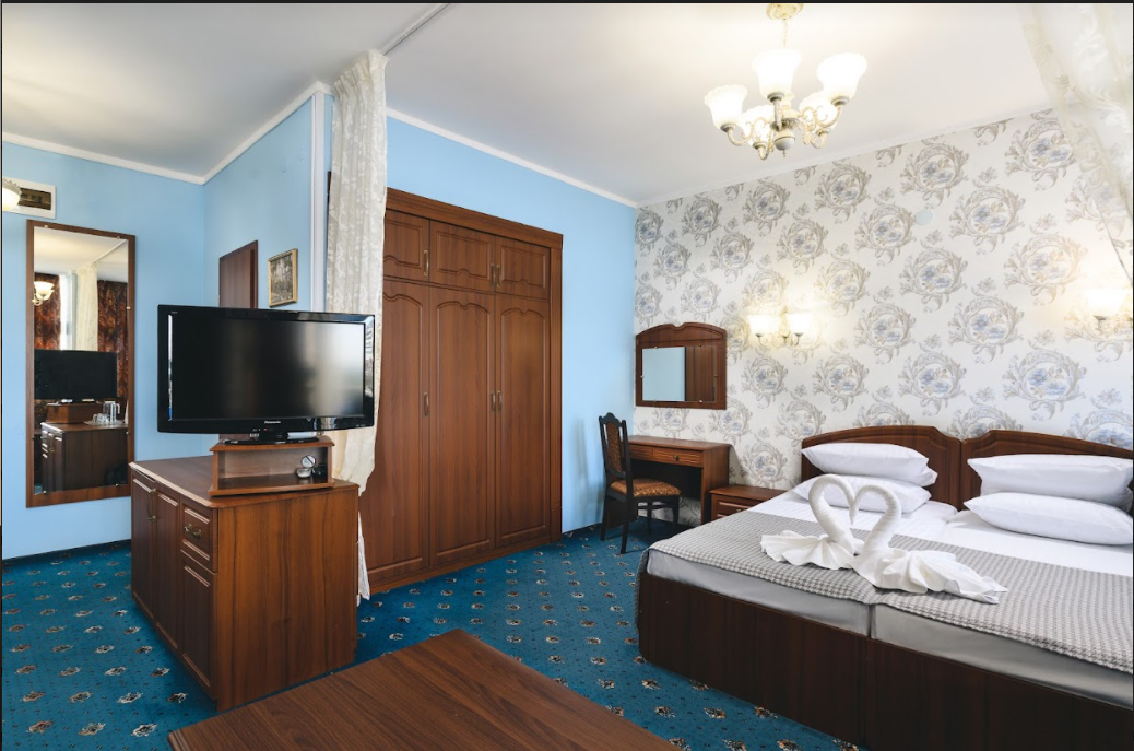 Площадь номера - 36 кв.м. 2 осн. места. 2 доп. места. Мебель: вешалка, диван, зеркало, кресло, кровати односпальные, прикроватные тумбочки, стол, стулья, тумба, шкаф. Оборудование: гладильная доска, кондиционер, набор посуды, сейф, телевизор, утюг, холодильник, чайный набор посуды, электрочайник. Санузел: с душем, тапочки, туалетные принадлежности, фен, халат. Сервис: смена полотенец, смена постельного белья, уборка номера.